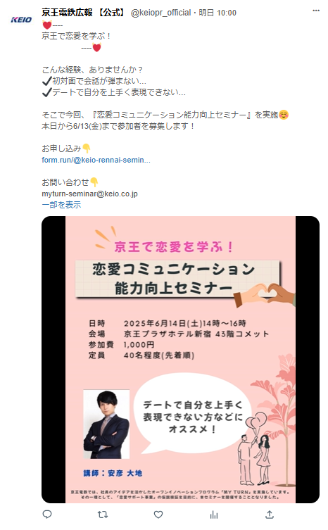 JLC協会本部です! 来たる6月14日(土)14:00〜16:00 京王プラザホテル43Fにて 当協会代表の安彦が 京王電鉄とコラボで 恋愛コミュニケーション能力向上セミナーに登壇いたします。 スケジュールの都合上、急遽の開催にはなりますが 価値のあるセミナーになることと思いますので 是非、たくさんの方にお越しいただければと思います。 ▽お申し込みはこちら▽ https://love-consultation.jp/jlcparty/detail/61 京王電鉄様の公式Xでも投稿中!